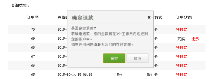 2.点击退款后网站弹出"确认退款"窗口(注:如图2),如果玩家想继续点击确认,否则点击取消。